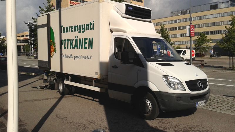 Tuoremyynti Pitkänen jatkaa pysäköintiä kevyenliikenteen väylällä Siltakadulla Entressen edessä toimittaessaan kukkia kukkakauppa Kukkakareen.