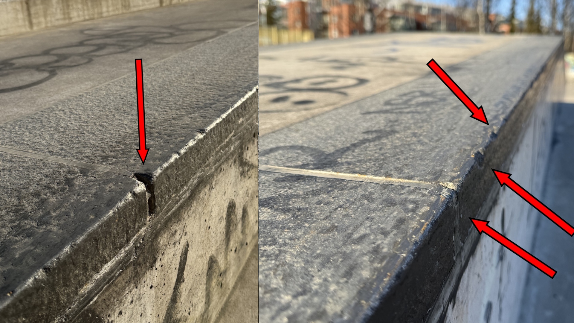 Skeittipuiston kivirakenteissa, erityisesti niin sanotuissa “kivikulmissa”, on tällä hetkellä merkittäviä ongelmia. Useissa kohdissa kivien saumakohdat tökkäävät, kun niitä yrittää “grindata”/liukua skeittilaudalla. Näiden pintojen tulisi olla täysin tasaisia ja saumattomia, jotta ne toimivat turvallisesti ja suunnitellulla tavalla.