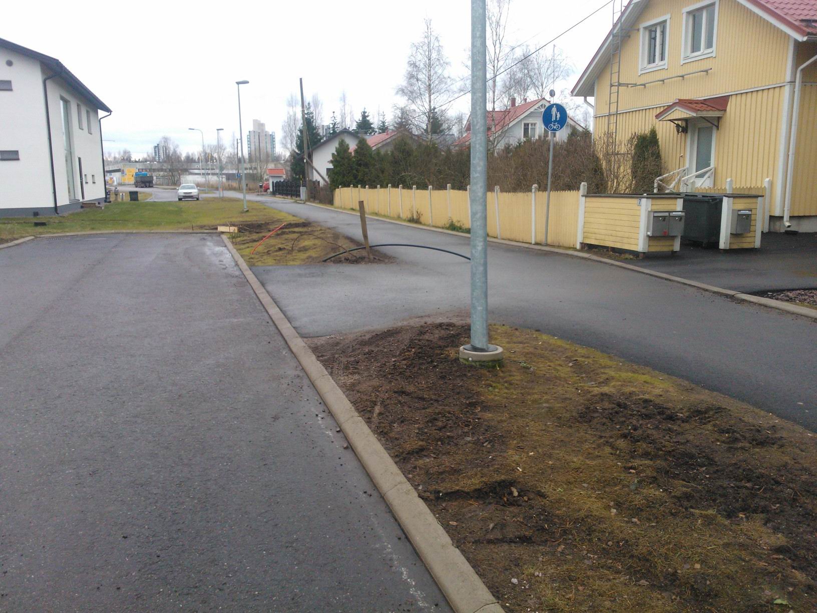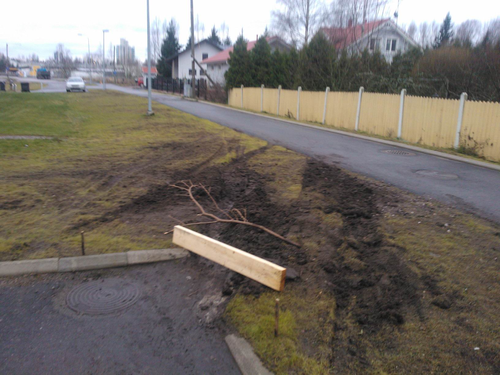 Kun Kattilatanhuan ja Tiilikulman yhteys ajoneuvoilta katkaistiin niin paikalle jäi laittamatta riittävä ajoneuvoliikenteen este. Nyt ajoneuvot kulkevat vanhan tottumuksen mukaan, kaiketi postiauto tai joku muu koska liikennettä on jatkuvasti. Nurmialue on tämän liikenteen vuoksi kamalassa kunnossa (kts. liitevalokuvat). Lisäksi kujan päähän keräytyy sadevedet johtuen kaivon väärästä sijainnista. Ehdotammekin että Espoo laittaa betoniporsasliikenne-esteen tai muun vastaavan estämään ajoneuvoliikenne kevyen liikenteen väylällä ja nurmikoiden poikki. Ltäkköongelma poistunee jos avo-ojaa profiloidaan syvemmäksi Tiilikulman suuntaan. Ystävällisin terveisin Tommi ja Ludmila Niemi.