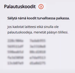 Muista ottaa talteen saamasi palautuskoodit, joita tarvitset, jos kadotat todentamiseen käyttämäsi laitteen. Yhtä palautuskoodia voi käyttää kerran.
